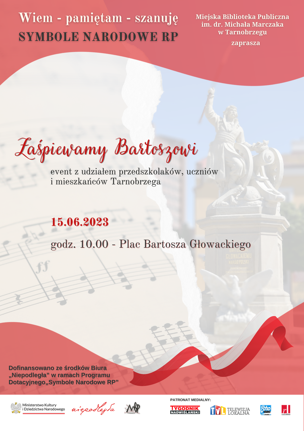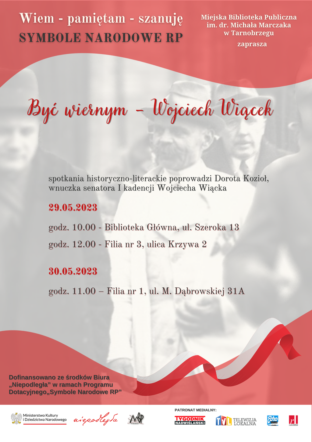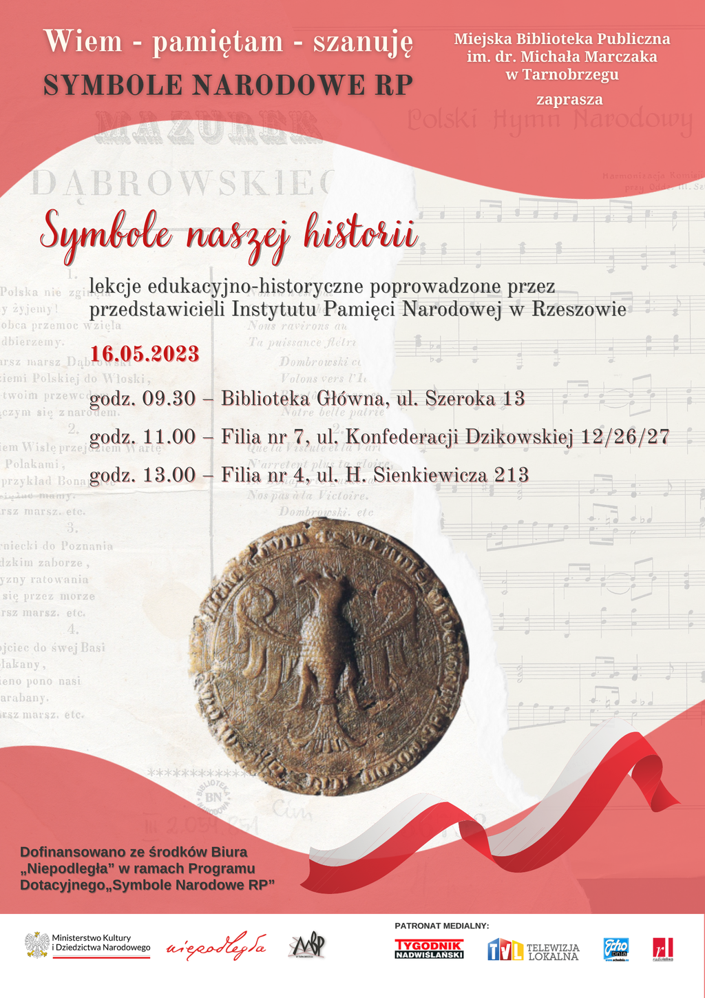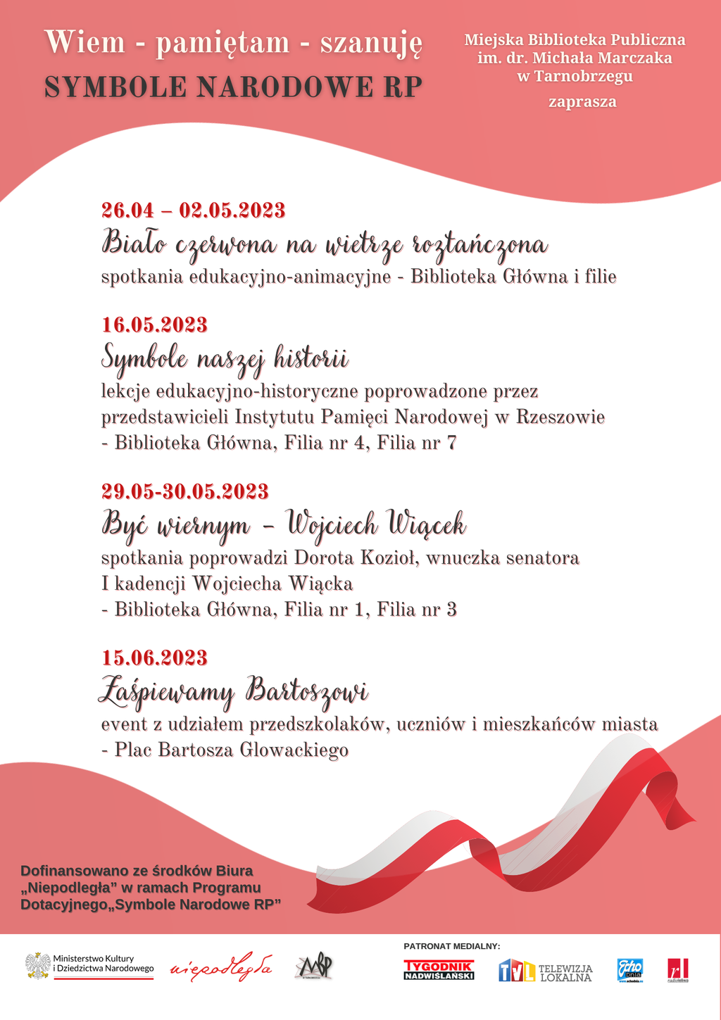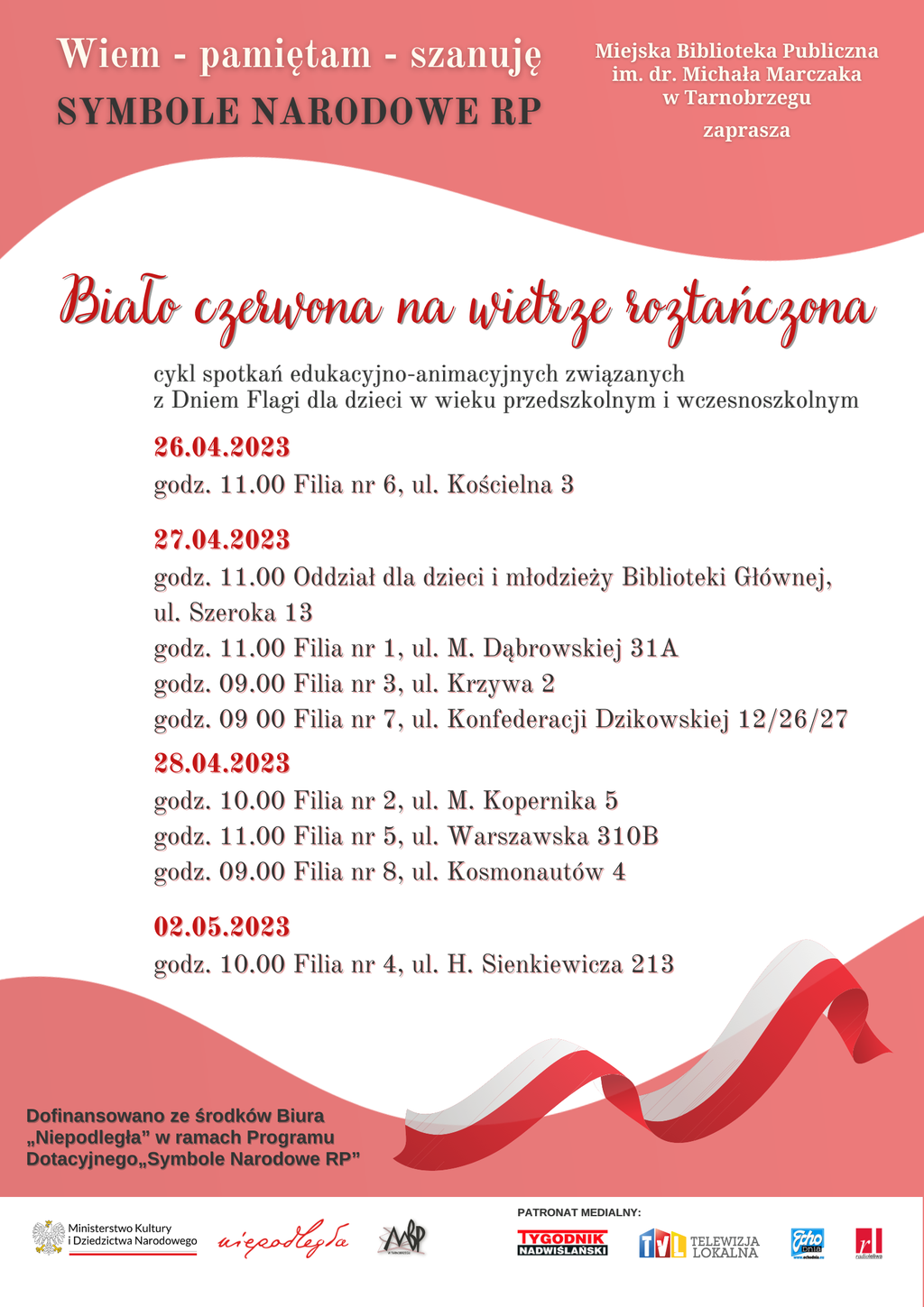 Spotkaniami „Biało czerwona na wietrze roztańczona”, w których uczestniczyły dzieci w wieku przedszkolnym i wczesnoszkolnym, Miejska Biblioteka Publiczna w Tarnobrzegu rozpoczęła realizację zadania „Wiem - pamiętam – szanuję” dofinansowanego ze środków Biura „Niepodległa” w ramach Programu Dotacyjnego „Symbole Narodowe RP”. Zadanie realizowane od 26.04.2023 do 15.06.2023 roku to ciąg wydarzeń edukacyjnych, których celem jest wskazanie jak ważną rolę odgrywają symbole narodowe w kształtowaniu poczucia przynależności do wspólnoty narodowej oraz szacunku i przywiązania do Ojczyzny.