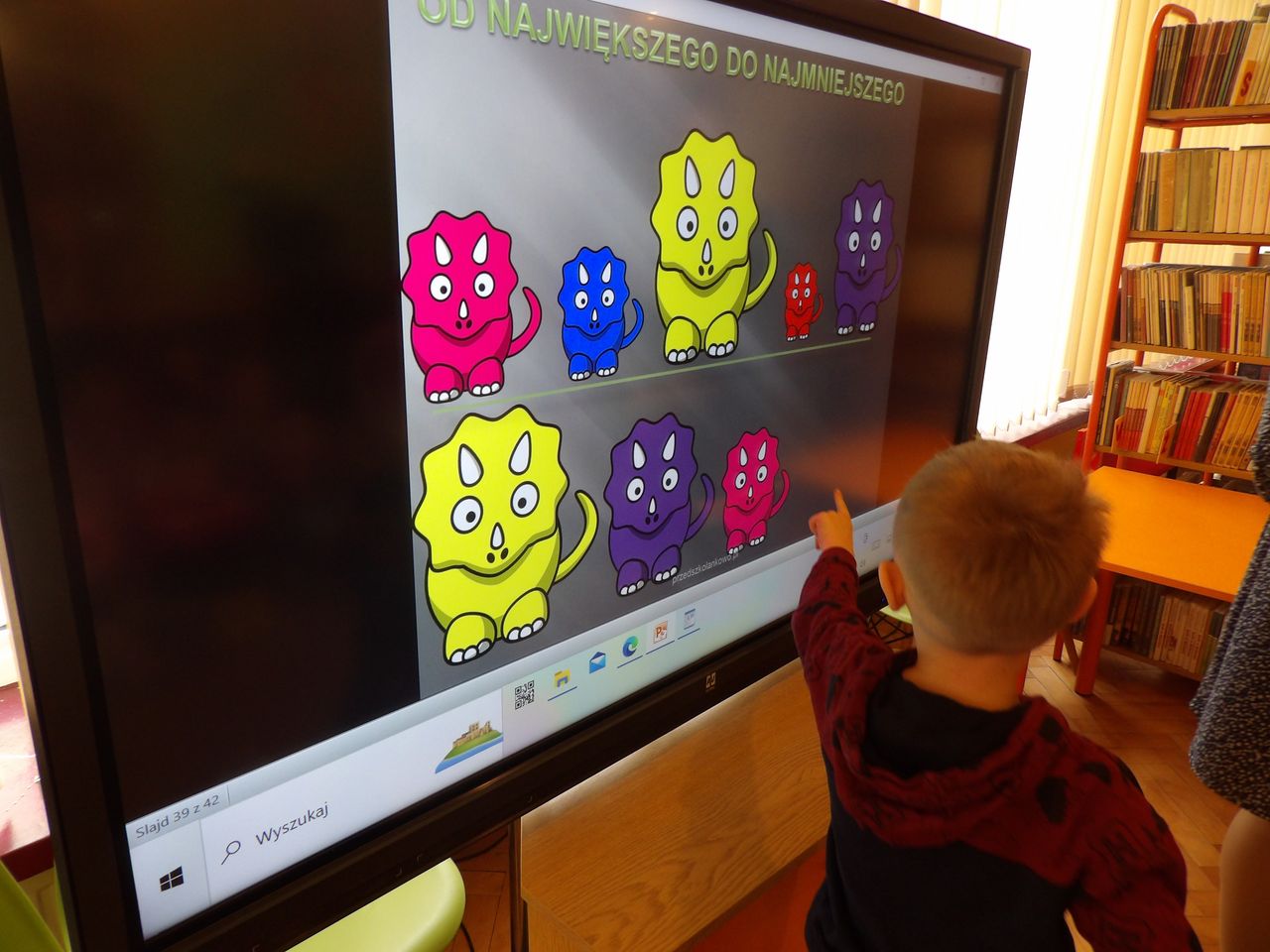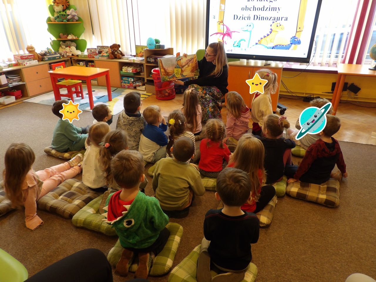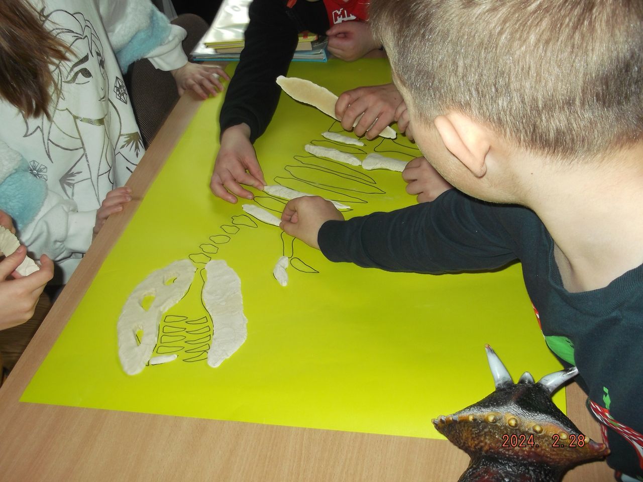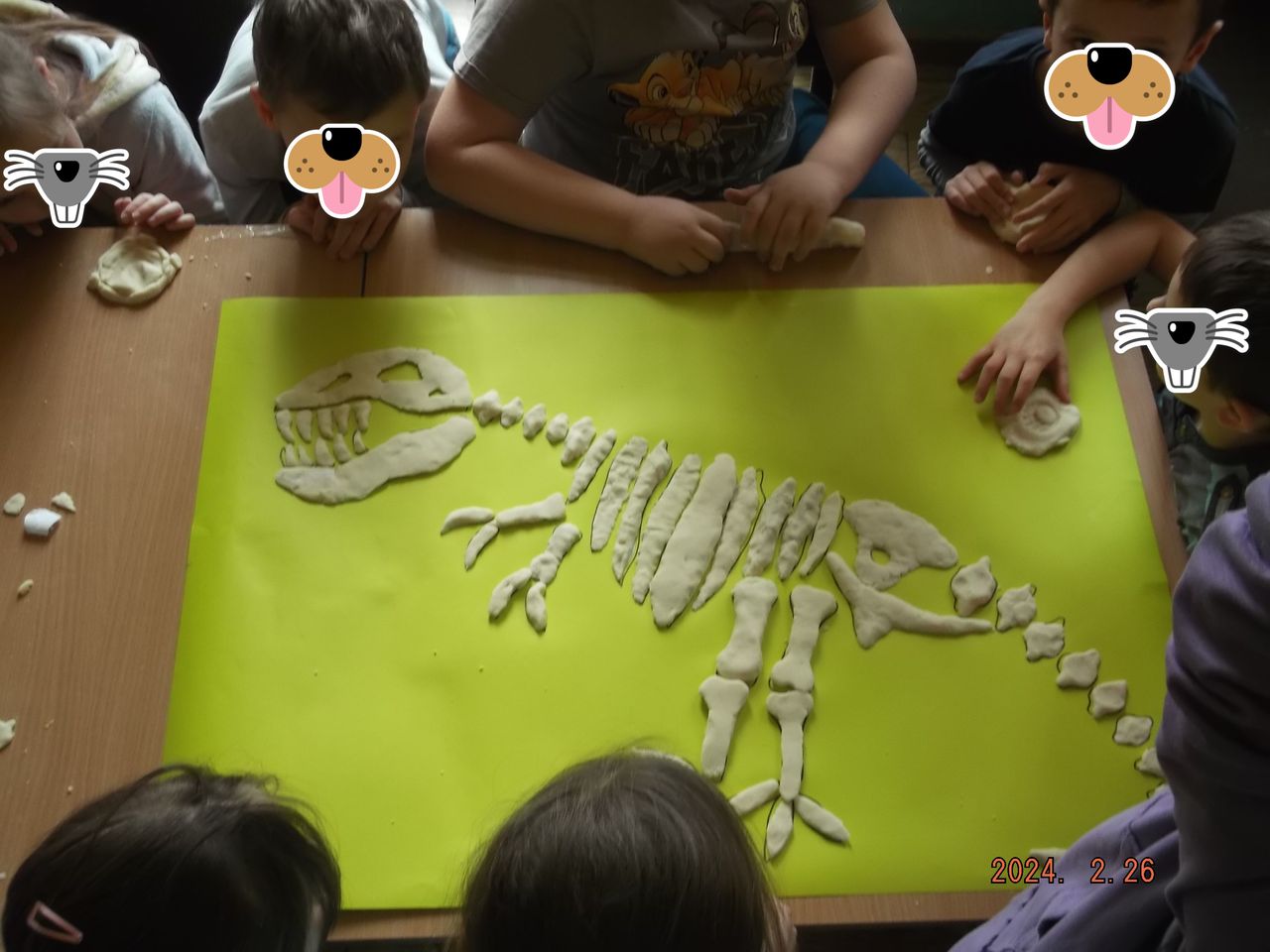Temat okazał się wyjątkowo ciekawy, a wiedza dzieci dotycząca dinozaurów ogromna! Zaskakiwały znajomością trudnych i skomplikowanych nazw prehistorycznych gadów. Przedszkolaki, dzięki prezentacji na monitorze interaktywnym, wraz z małym dinozaurem Dinem przeniosły się do świata sprzed milionów lat. Poznały tam przedstawicieli roślinożernych i mięsożernych dinozaurów, dinozaury latające, pływające i żyjące na lądzie. Dowiedziały się czym zajmuje się paleontolog i co to są skamieliny. Świetnie poradziły sobie z dinozaurowymi zagadkami i łamigłówkami. Stworzyły także kolorowe tematyczne prace plastyczne. Dodatkowo robiły swoje „wykopaliska” by następnie ułożyć szkielet dinozaura.