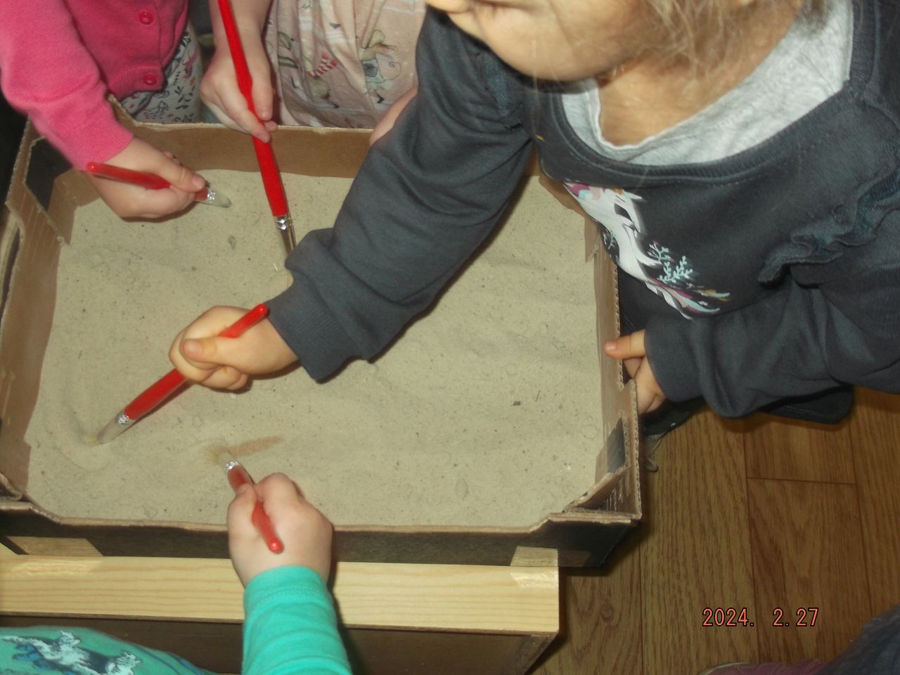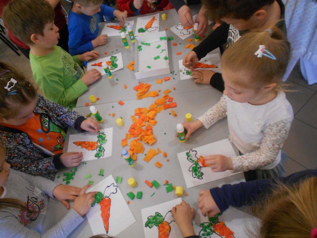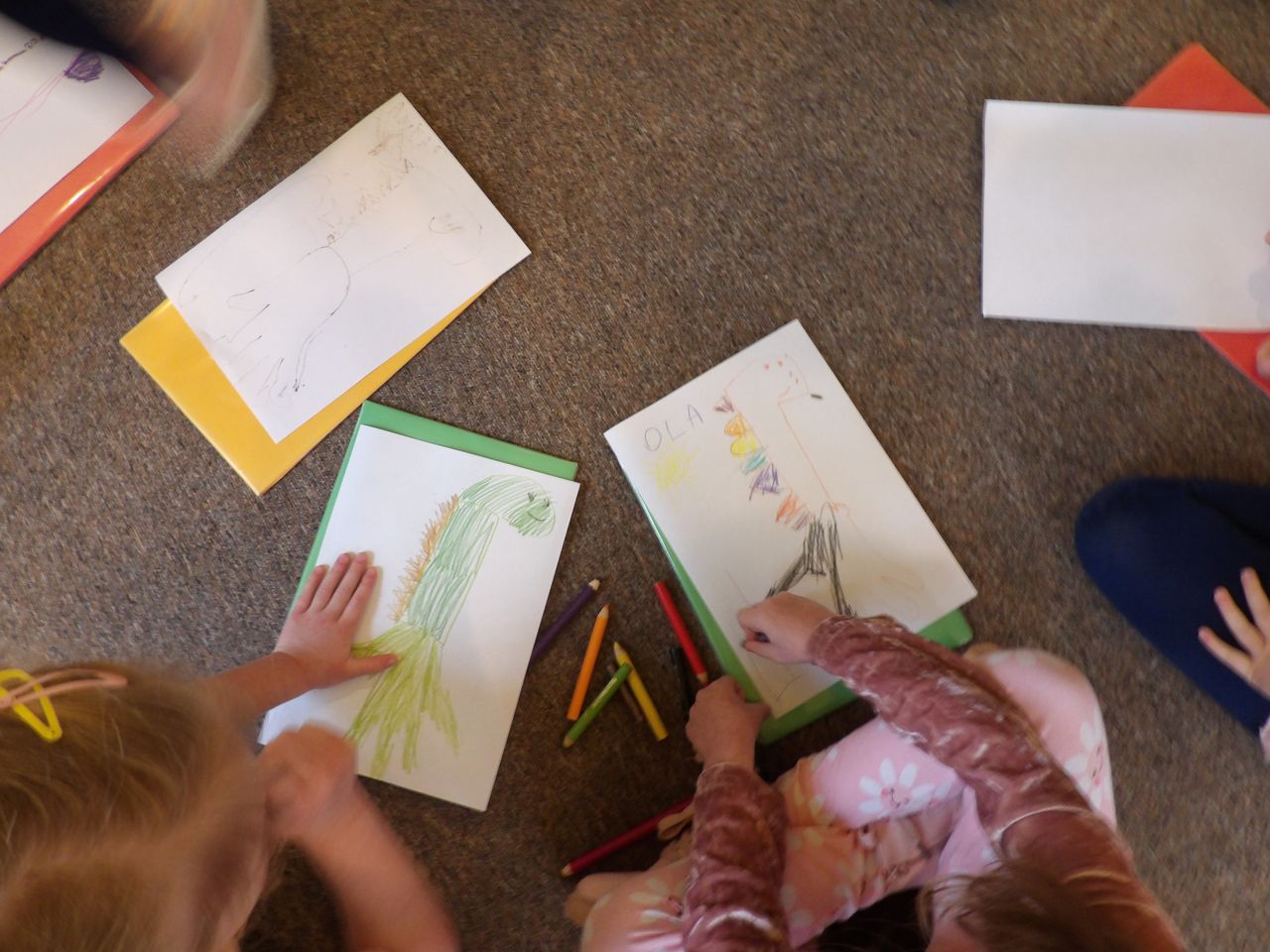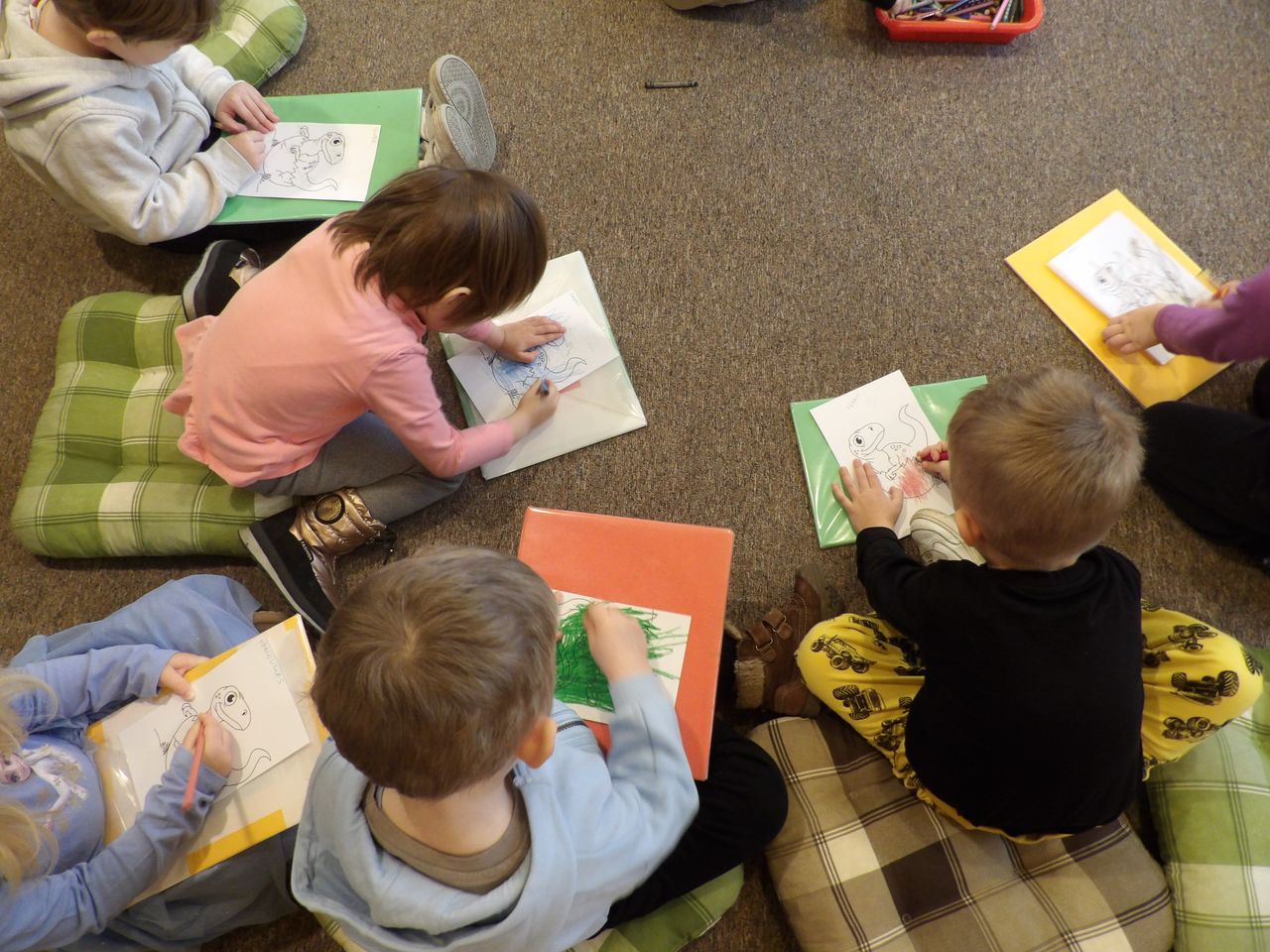 Temat okazał się wyjątkowo ciekawy, a wiedza dzieci dotycząca dinozaurów ogromna! Zaskakiwały znajomością trudnych i skomplikowanych nazw prehistorycznych gadów. Przedszkolaki, dzięki prezentacji na monitorze interaktywnym, wraz z małym dinozaurem Dinem przeniosły się do świata sprzed milionów lat. Poznały tam przedstawicieli roślinożernych i mięsożernych dinozaurów, dinozaury latające, pływające i żyjące na lądzie. Dowiedziały się czym zajmuje się paleontolog i co to są skamieliny. Świetnie poradziły sobie z dinozaurowymi zagadkami i łamigłówkami. Stworzyły także kolorowe tematyczne prace plastyczne. Dodatkowo robiły swoje „wykopaliska” by następnie ułożyć szkielet dinozaura.