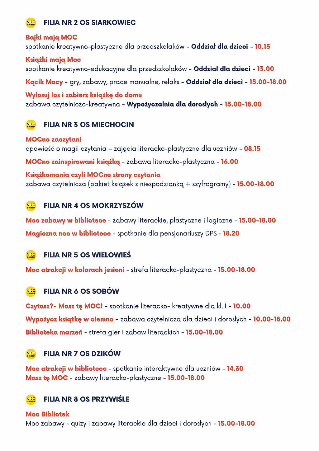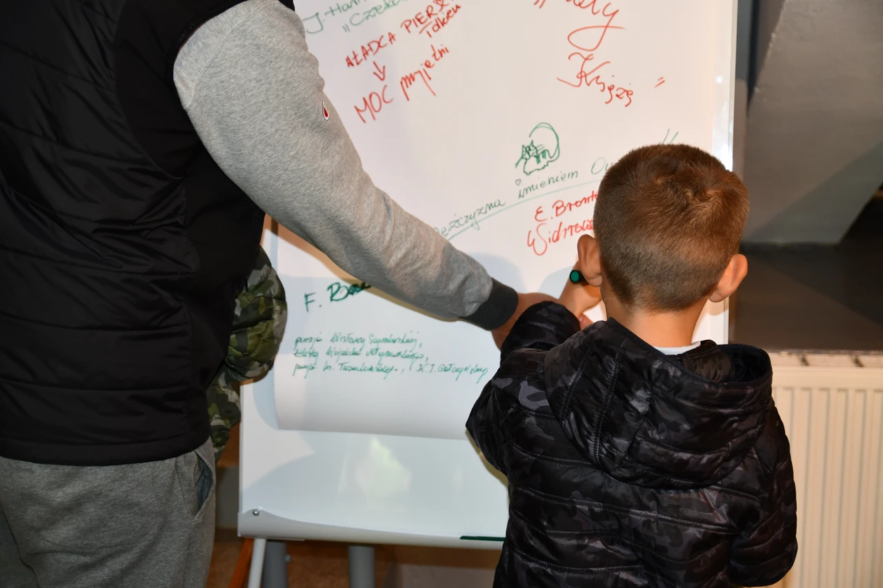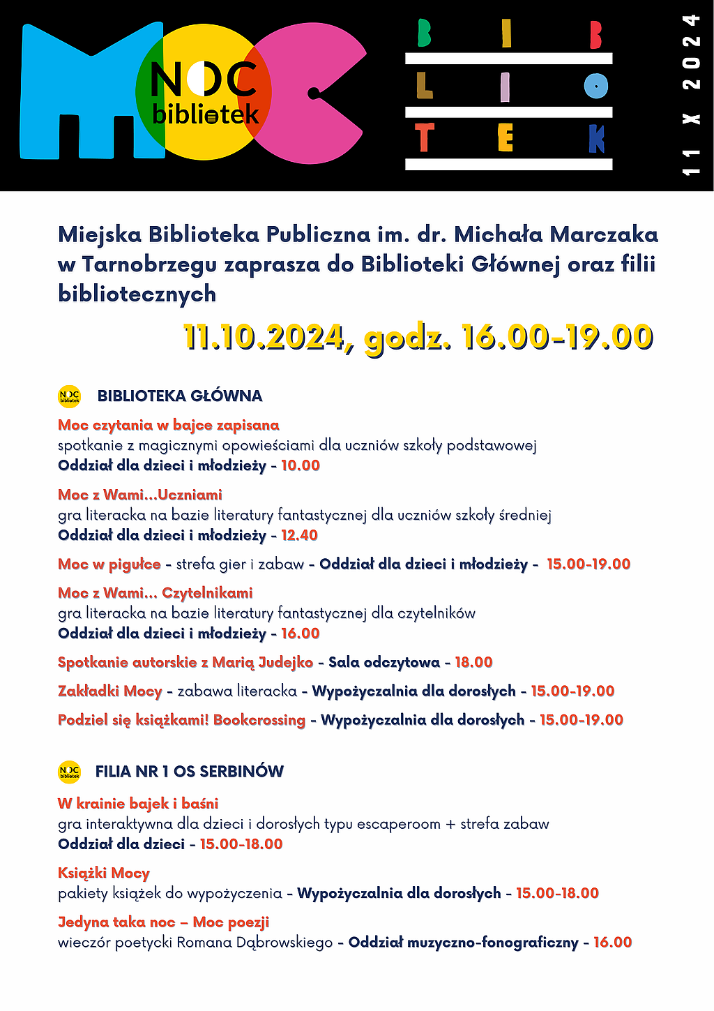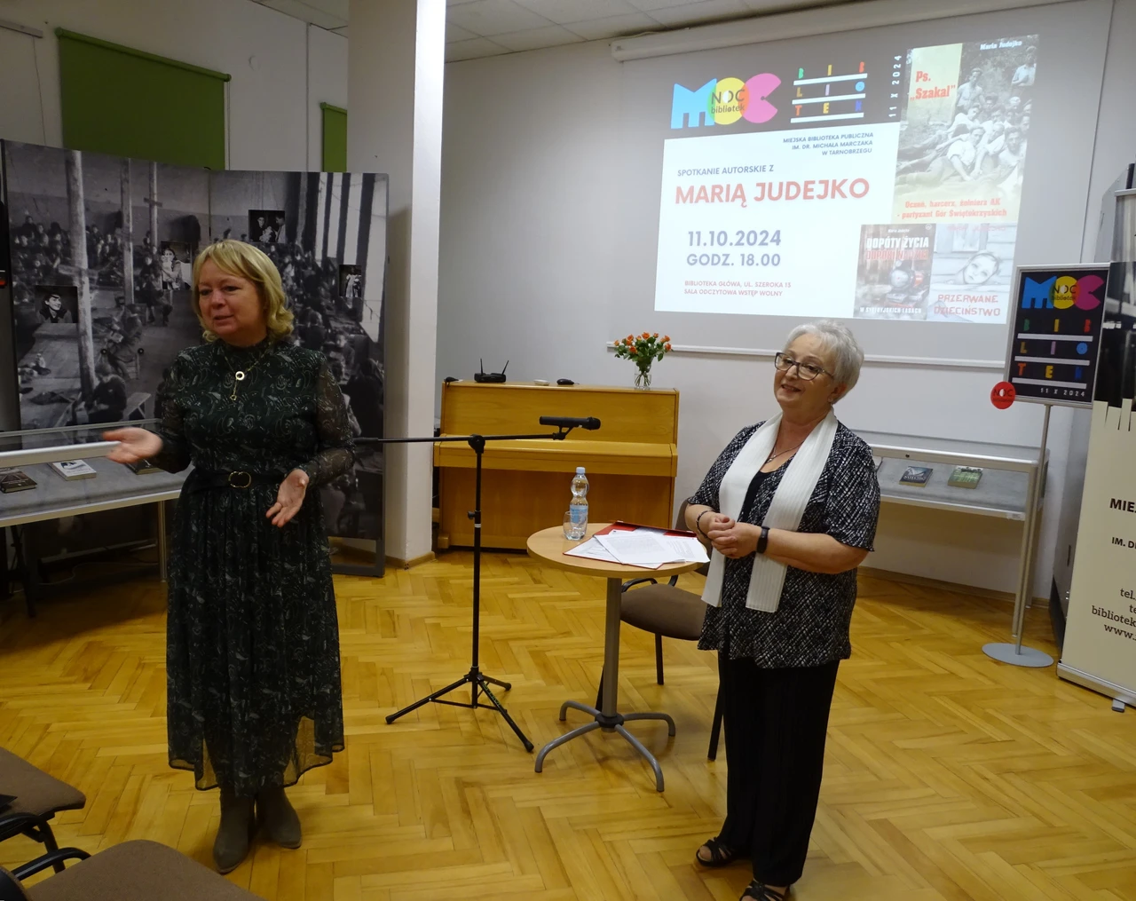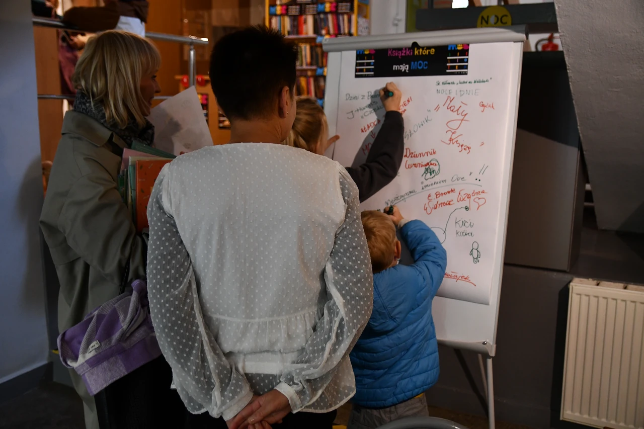 Za nami X jubileuszowe wydanie ogólnopolskiej Nocy Bibliotek – wielkiego święta bibliotek i czytania, które odbyło się w piątek 11 października w tysiącach bibliotek w całej Polsce, w tym także w Miejskiej Bibliotece Publicznej im. dr. M. Marczaka. W nawiązaniu do tegorocznego hasła – „Moc Bibliotek” – bibliotekarki już po raz dziesiąty przygotowały szereg ciekawych i inspirujących form, pokazujących moc kryjącą się w bibliotekach, które w tym roku przeprowadzono zarówno w Bibliotece Głównej, jak i w każdej filii bibliotecznej. Dzięki temu wszyscy czytelnicy, zarówno dzieci, młodzież jak i dorośli, w swoich osiedlowych bibliotekach mogli włączyć się w obchody Nocy Bibliotek. Wśród wydarzeń były spotkania literackie, edukacyjne, plastyczne dla przedszkolaków i uczniów, podczas których powstały piękne prace plastyczne a także można było wykazać się kreatywnością i spostrzegawczością przy wykonywaniu czytelniczych wyzwań. Ponadto w każdej filii i agendzie w godzinach popołudniowych czekały na odwiedzających strefy gier i zabaw, zabawy czytelnicze, pakiety książek, zakładki mocy, loteria z niespodziankami, kolorowanki i szyfrogramy. Odbyły się także gry i zabawy zespołowe, zarówno interaktywne, jak i plastyczne, inspirowane literaturą różnego gatunku, w tym także fantastyczną, które dzięki ukrytym kopertom z niełatwymi zadaniami przeprowadziły graczy przez zakamarki bibliotek. Szczególnym punktem w programie Nocy Bibliotek było spotkanie z Marią Judejko – autorką książek „Dopóki życia. Dopóki nadziei’, „Tajemnica starej leśniczówki”, „Przerwane dzieciństwo”, „Ps. Szakal”, „Maciek z pokolenia przełomu” oraz wieczór poetycki Romana Dąbrowskiego – wiceprezesa Tarnobrzeskiego Koła Polskiego Związku Niewidomych i uczestnika bibliotecznego Dyskusyjnego Klubu Książki. Tematyka, jaką Pani Maria Judejko podejmuje w swoich książkach, które dostępne są w naszych zbiorach, doskonale wpisała się w tegoroczne hasło akcji. Moc Bibliotek – moc książek, z których płynie siła, wiara, nadzieja i miłość. Pani Maria, obecnie mieszkanka Chojnic, przez wiele lat związana była z Tarnobrzegiem. To właśnie w Tarnobrzegu, po przejściu na emeryturę, rozpoczęła swoją przygodę z pisarstwem. Jak sama twierdzi pisanie to pasja i sposób na wolny czas. Jej książki to głównie wspomnienia osób które przeżyły wojnę i okupację. W trakcie spotkania autorka, mająca już na swoim koncie kilka tytułów, przybliżyła kulisy powstania każdego z nich. Mówiła o emocjach jakie towarzyszyły rozmowom z bohaterami w trakcie zbierania materiału. Na okazję X jubileuszowego wydania ogólnopolskiej Nocy Bibliotek w Filii nr 1 zaplanowany został wieczór poetycki Pana Romana Dąbrowskiego – z wykształcenia filozof, były nauczyciel przedsiębiorczości, wykładowca akademicki oraz doradca i coach – który w 2020 r. opublikował „Pamiętnik ze snów”, swój debiutancki tomik. Podczas spotkania można było wysłuchać utworów w interpretacji Klubowiczek DKK, Pani Teresy Biało i bibliotekarek, jak również poznać najnowsze, jeszcze nie opublikowane utwory. Dla wszystkich była to okazja, by zatrzymać się na chwilę w biegu codzienności, wzruszyć o i wsłuchać się w słowa, które skłaniają do refleksji i głębszych spostrzeżeń. Wydarzeniu towarzyszyła wystawa gobelinów Pani Teresy Biało – prezes koła Polskiego Związku Niewidomych w Tarnobrzegu i haftowanych obrazów Pani Krystyny Barnaś. Wystawę można podziwiać w Oddziale muzyczno-fonograficznym w Filii nr 1 do końca października.