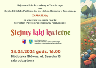 W środę, 24 kwietnia 2024 roku, wręczono nagrody laureatom Powiatowego Konkursu Plastycznego „Siejmy łąki kwietne” zrealizowanego pod patronatem Starosty Powiatu Tarnobrzeskiego oraz Prezydenta Miasta Tarnobrzega przez Rejonowe Koło Pszczelarzy w Tarnobrzegu przy współpracy z Miejską Biblioteką Publiczną im. dr. Michała Marczaka. Komisja Konkursowa spośród 111 zakwalifikowanych do oceny prac nadesłanych z Tarnobrzega, Gorzyc, Grębowa, Jadachów i Nowej Dęby przyznała nagrody i wyróżnienia: