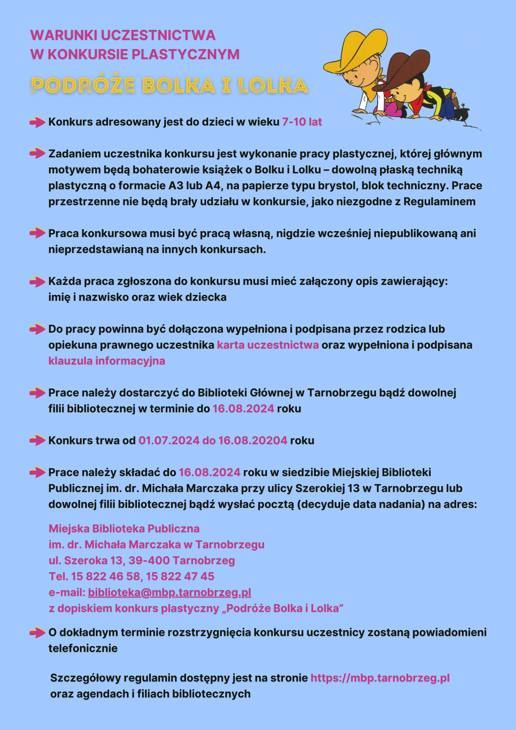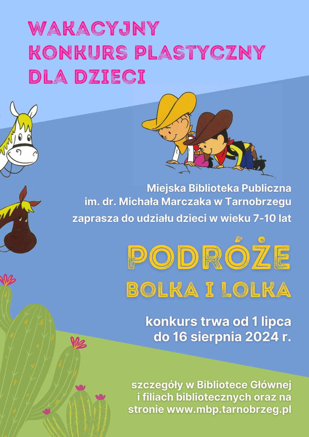 Wybierz się w bajeczną podróż razem z Bolkiem i Lolkiem – bohaterami książek i bajeczek dla dzieci. Weź udział w konkursie plastycznym i wykonaj (dowolną płaską techniką plastyczną) pracę plastyczną o formacie A4, której głównym motywem będą bohaterowie książek o Bolku i Lolku. Konkurs adresowany jest do dzieci w wieku 7-10 lat a trwać będzie od 1 lipca do 16 sierpnia. Prace należy składać w Bibliotece Głównej bądź wybranej filii bibliotecznej w terminie do 16 sierpnia wraz z wypełnioną i podpisana kartą zgłoszenia oraz klauzulą informacyjną. Szczegółowe informacje dotyczące konkursu znajdują się na stronie www.mbp.tarnobrzeg.pl w zakładce Konkursy. Zapraszamy do literacko-plastycznych podróży!