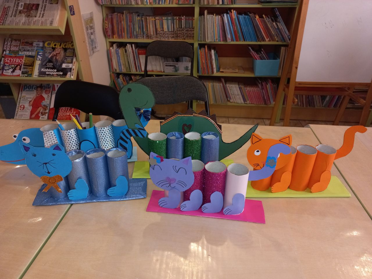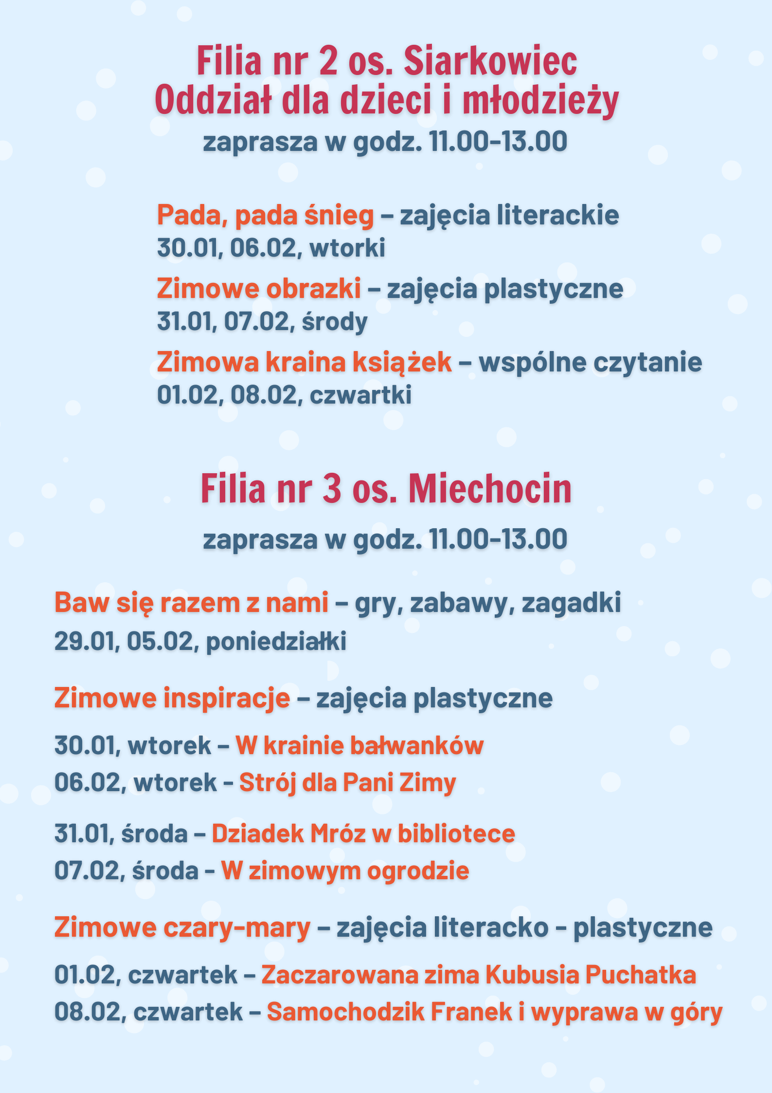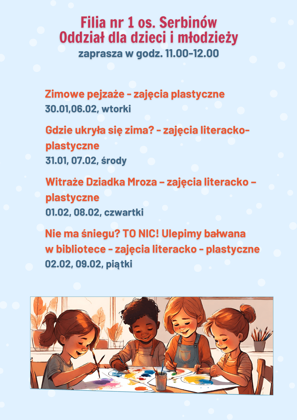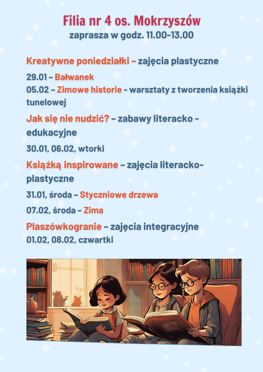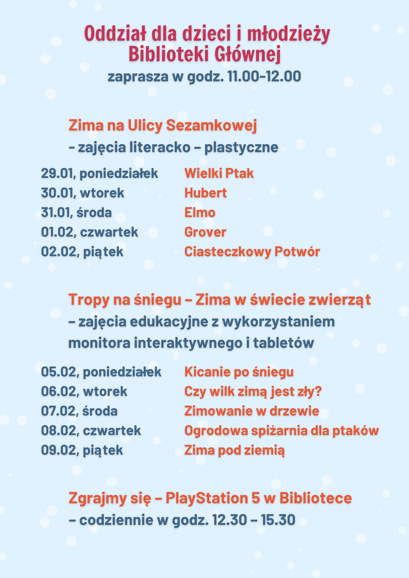 Podczas ferii – w Bibliotece Głównej oraz filiach bibliotecznych – nie zabrakło także, znanych i lubianych form aktywności. Mali artyści i miłośnicy książek uczestniczyli w zajęciach plastycznych i literacko-plastycznych, na których powstały wyjątkowe prace inspirowane przeczytanymi wcześniej wierszami, opowiadaniami czy fragmentami książek. Dzieci stworzyły bohaterów „Ulicy Sezamkowej”, zimowe drzewa i pejzaże, Panią zimę, witraże Dziadka Mroza czy Bajkowe osiołki. Odczyniały „Zimowe czary-mary”. Były z wizytą „W królestwie kwadratów i trójkątów”. Dowiedziały się „Gdzie ukryła się zima?” i „Jak się nie nudzić?”. Inspirowały się książkami z serii „Ulica Sezamkowa”, wierszami Marii Konopnickiej i Kazimierza Śladewskiego oraz tytułami tj. „Młodzi przyrodnicy. Zima w świecie zwierząt”, „Zimowe zabawy”, „Posłuchajcie bajki nowej, prostokątnej i kwadratowej”, „Jestem przedszkolakiem. Zima – sen misiowy” czy „Zima” M. Strzałkowskiej. Dodatkową atrakcją niektórych zajęć były kody QR, tablety oraz monitor interaktywny.