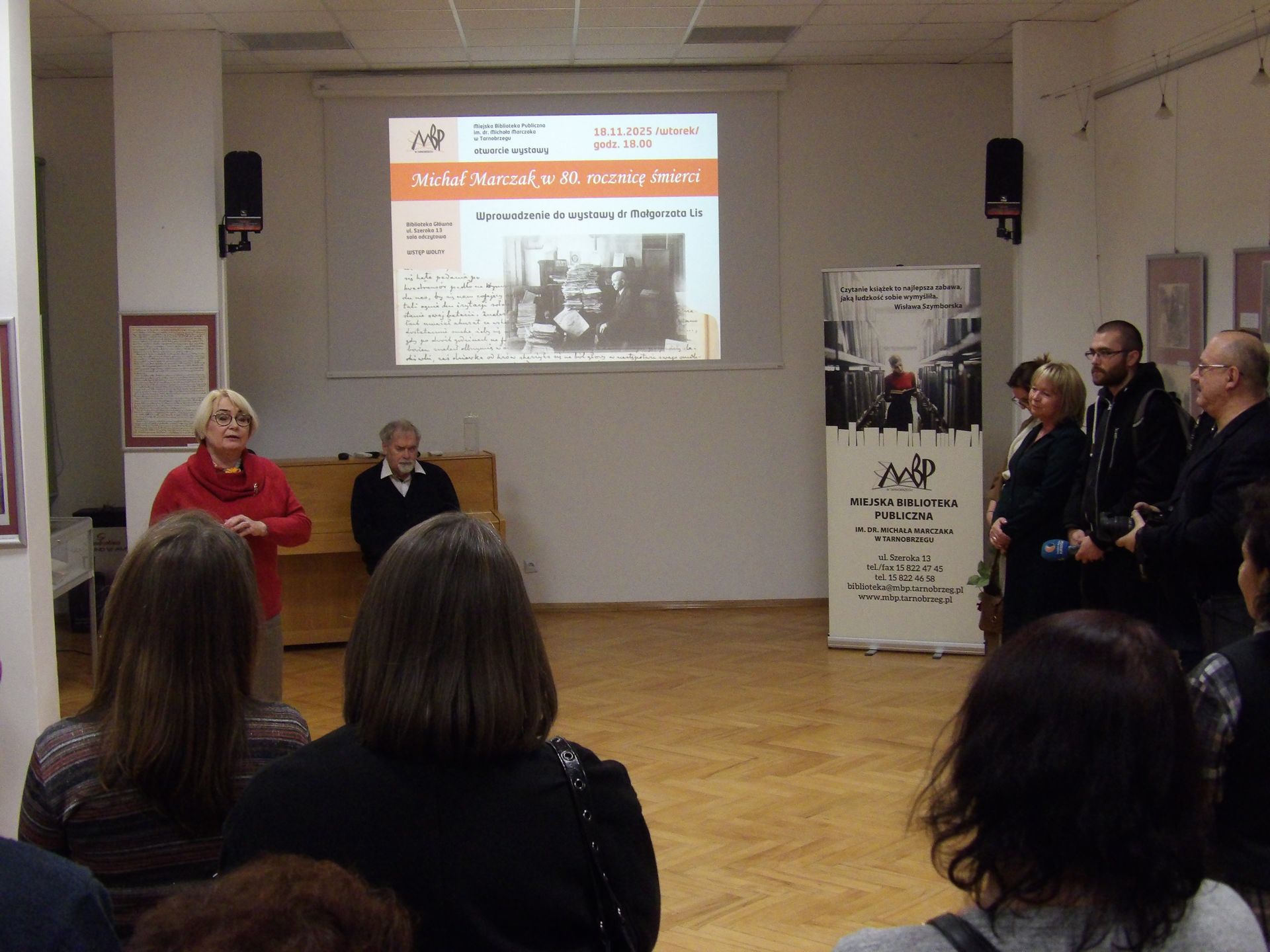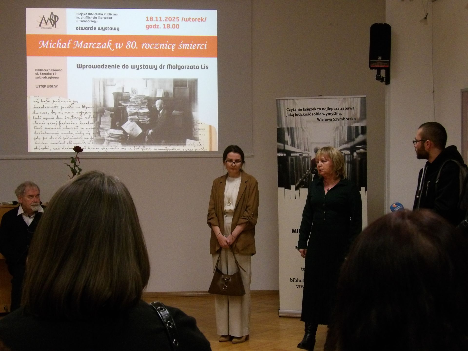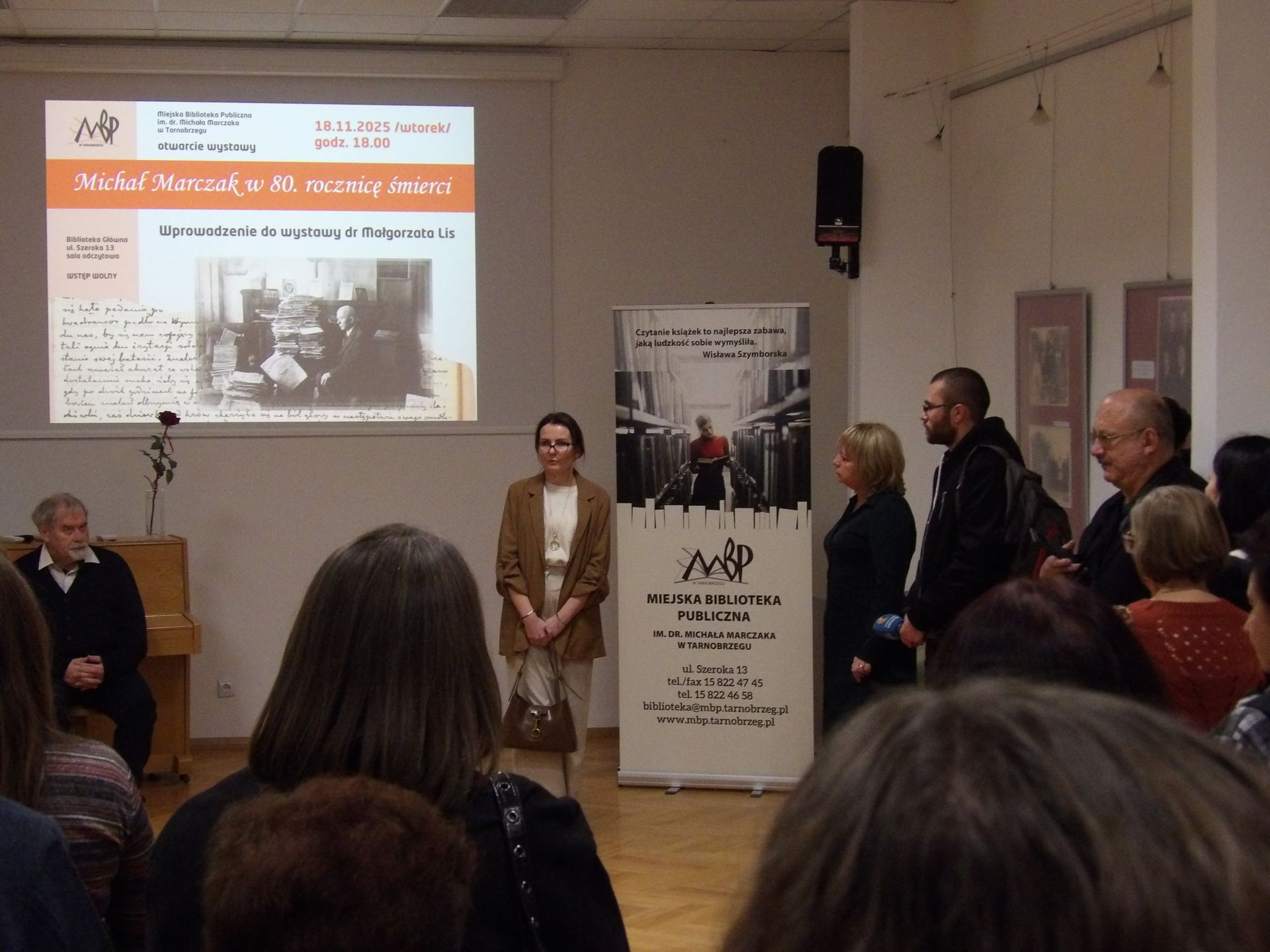 Michał Marczak, archiwista zbiorów dzikowskich, jeden z prekursorów regionalizmu w Polsce, od 2006 roku patronuje Miejskiej Bibliotece Publicznej w Tarnobrzegu. NadanieJego imienia Bibliotece to uhonorowanie zasług na niwie bibliotekarstwa, etnografii,pedagogiki i działalności społecznikowskiej. Dokładnie 18 listopada 2025 roku, równo w 80. rocznicę śmierci Dzikowskiego Bibliotekarza otwarto wystawę, przypominającą jego życie idorobek twórczy. Ekspozycja, na którą składają się fotografie, publikacje, dokumenty, listy,notatki oraz kroniki z rodzinnych wycieczek, spisywane przez Marczaka, to materiałypotwierdzające jego wszechstronną działalność oraz silny związek z Dzikowem a dokładnie księgozbiorem dzikowskim na przestrzeni lat. Wiele z nich dzisiaj stanowi doskonałe źródło historyczne. Podczas wernisażu wystawę zaprezentowała Monika Sadkowska – Dyrektor Miejskiej Biblioteki Publicznej zwracając szczególną uwagę na korespondencję Michała Marczaka, która jest świadectwem zarówno czasów, jak i osobistego zaangażowania Marczaka w losy znajomych i przyjaciół. Dr Małgorzata Lis, autorka publikacji "Z Grywałdu na Uniwersytet Jagielloński. Życie i działalność kulturalno-oświatowa Michała Marczaka (1886-1945)”, w swoim wystąpieniu przeniosła uczestników wydarzenia w czasy, kiedy "poznawała” życie i fascynującą działalność protagonisty swojego przewodu doktorskiego, tym samym pokrótce, przedstawiła jego drogę awansu zarówno społecznego jak i zawodowego. Natomiast wrażeniami z wizyty w Grywałdzie, rodzinnej miejscowości Marczaka podzieliła się Beata Kotasiak – Wójcik, kierownik Muzeum Polskiego Przemysłu Siarkowego.