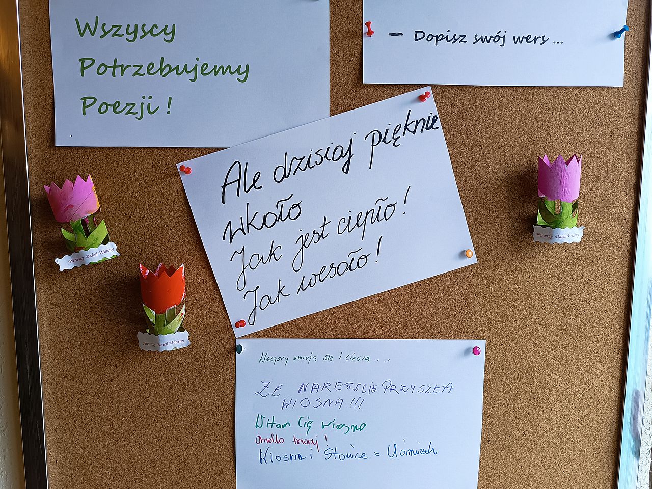 Biblioteka na wiosnę rozkwitła poezją, a wszystko za sprawą Światowego Dnia Poezji, który przypadł 21 marca, czyli dzień po pierwszym dniu Wiosny. We wszystkich agendach i filiach bibliotecznych poezja wystąpiła w roli głównej. Czytelnicy wzięli udział we wspólnej poetyckiej zabawie. Uczestniczyli w loterii, robili zdjęcia w poetyckiej foto-budce i odkrywali poezję. Zostawili także po sobie literacki ślad i dołożyli coś od siebie do poetyckiej układanki – na specjalnie przygotowanej tablicy, wers po wersie, stworzyli wspólnie wiersz i poczuli magię poezji. Na każdego, kto tego dnia odwiedził bibliotekę czekały poetyckie niespodzianki – odkryte na bibliotecznej ladzie a także ukryte między regałami. Obyło się także szereg spotkań dla przedszkolaków, na których bibliotekarki oraz uczestnicy Tarnobrzeskiego Centrum Seniora czytali dzieciom polską poezję, zarówno współczesną, jak i klasyczną. Dodatkowo, podczas zajęć literacko-plastycznych powstały piękne wiosenne prace inspirowane poezją. Dziękujemy za wspólną literacką zabawę!