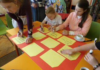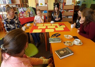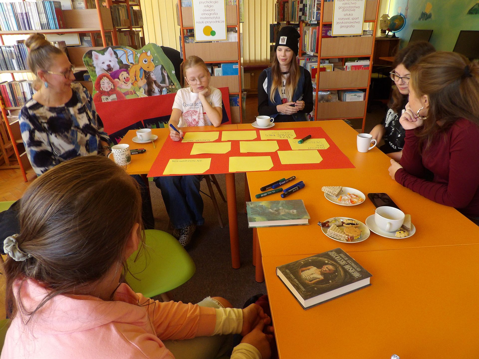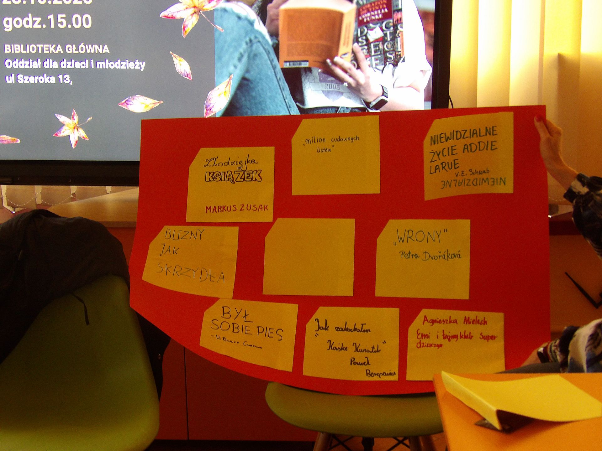 Październikowe spotkanie Dyskusyjnego Klubu Książki dla młodzieży odbyło się w Bibliotece Głównej. Nowa przestrzeń sprzyjała swobodnym rozmowom o ulubionych książkach, o tym, co daje nam czytanie oraz o pierwszych wyborach czytelniczych, które wpłynęły na obecne gusta literackie. Tytuły książek, które zostawiły wyjątkowy ślad w pamięci uczestniczek i które – według nich – warto przeczytać znalazły swoje miejsce na wspólnie stworzonym plakacie. To była wartościowa wymiana czytelniczych inspiracji. Już czekamy na kolejne spotkanie, które odbędzie się 27 listopada o godz. 15.30. Zapraszamy młodzież do Biblioteki Głównej.